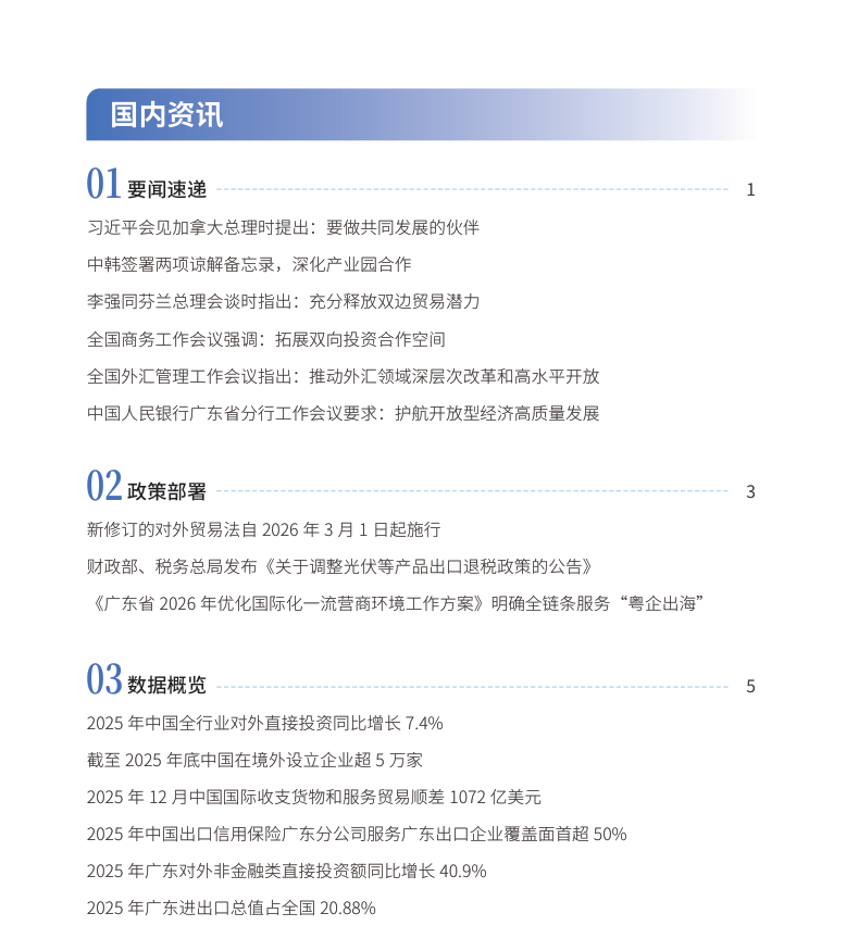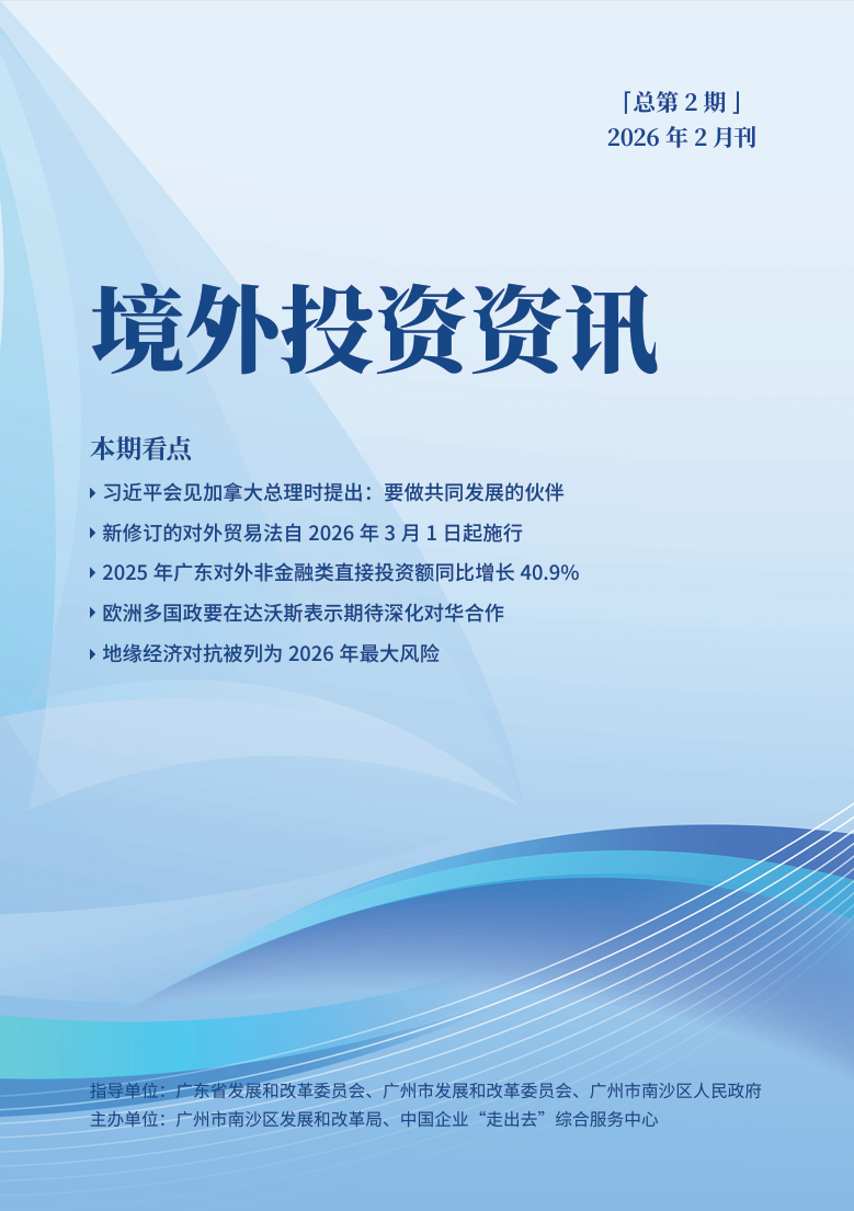 《境外投资资讯》2月刊来了!本刊由广东省发展和改革委员会、广州市发展和改革委员会、广州市南沙区人民政府指导,广州市南沙区发展和改革局以及中国企业“走出去”综合服务中心主办,南方新闻网承办,突显权威专业底色,聚焦最新出海政策、海外风险信息与实战案例,为企业出海精准导航。