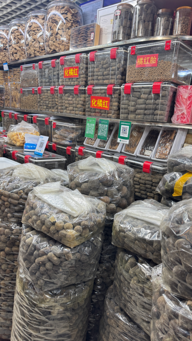 作为华南地区核心药材集散地,清平药材市场内,化橘红干果、饮片、胎果、切片等品类一应俱全,市民、游客、药店采购商往来不断。