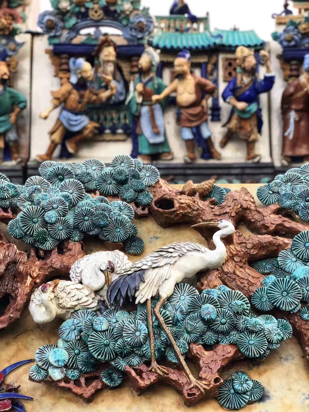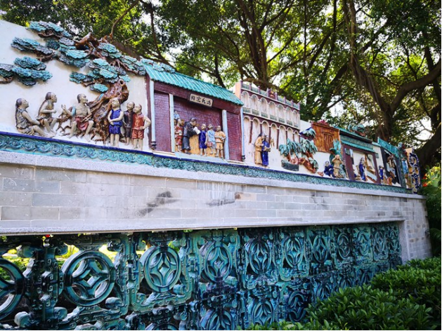 与其他陶艺作品不同,陶塑瓦脊通常长二十米左右,是几十乃至几百个陶艺物件的组合,主要用作岭南古建筑屋脊上的装饰,明清时期风靡于岭南地区以及东南亚地区。在如今的粤剧艺术博物馆、南海神庙、佛山祖庙等一些岭南古建筑或仿古建筑的屋脊上,都能看到这样的“技艺”。