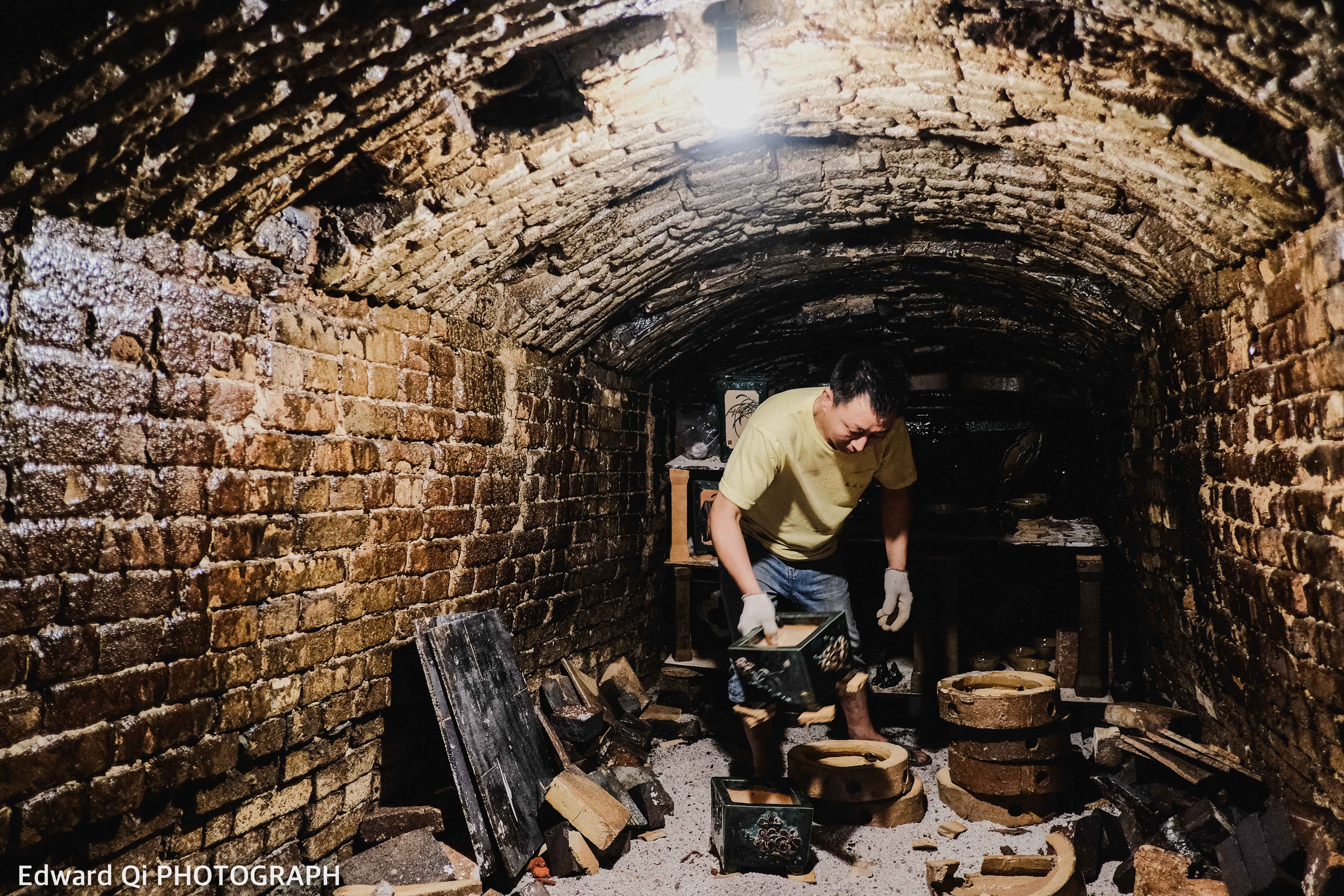 陶艺师傅准备把烧好的作品拿到窑外
