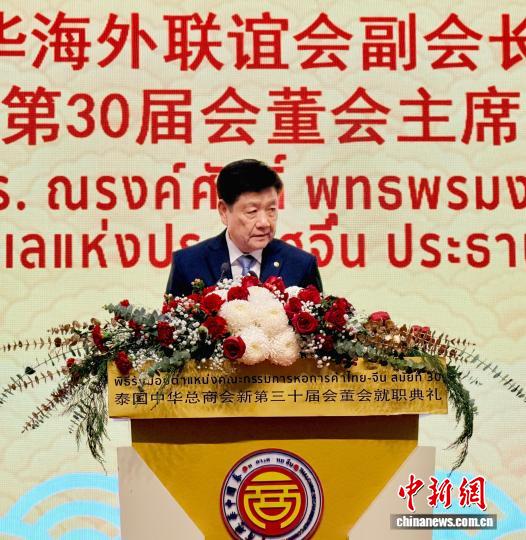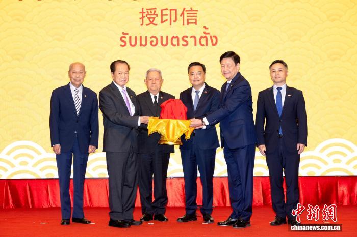 中新网曼谷1月28日电 (李映民 刘宇博)泰国中华总商会28日隆重举办新第三十届会董会就职典礼。中国驻泰国大使张建卫、泰国枢密院主席素拉育·朱拉暖主持仪式,大会主席刘锦庭向蝉联第三十届会董会主席的林楚钦授印信。
