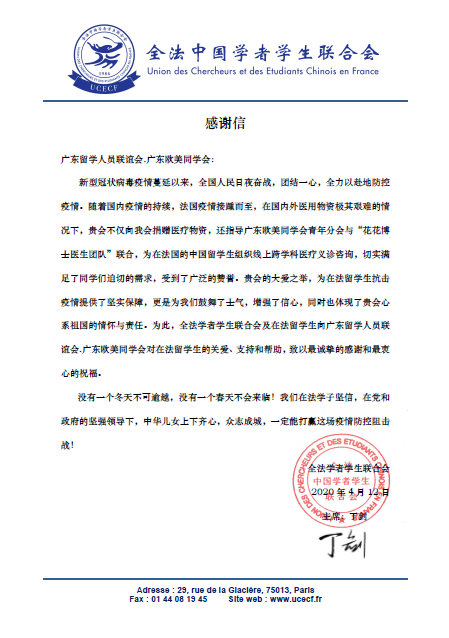 一些海外留学生团体还向广东省委统战部和广东欧美同学会发来感谢信。“贵会不仅向我会捐赠医疗物资,还指导广东欧美同学会青年分会与‘花花博士医生团’联合,为在法国的中国留学生组织线上跨学科会诊医疗咨询,切实满足了同学们迫切的需要,受到了广泛的赞誉。贵会的大爱之举,为在法留学生抗击疫情提供了坚实保障,更是为我们鼓舞了士气,增强了信心。”全法学者学生联合会在致广东欧美同学会的感谢信中深情致谢。