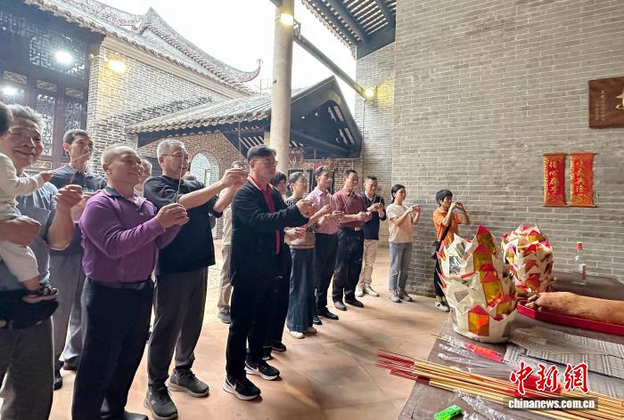 3月31日一大早,佛山市顺德区伦教街道羊额卢氏大宗祠迎来海外游子,旅美三邑总会馆主席卢炳坤与族人一起,在供桌上摆好祭品,随后向祖宗牌位鞠躬、上香、敬酒。“慎终追远是中国人的传统文化。我们的根在顺德,这几年清明都会回来祠堂拜一拜祖先。”卢炳坤告诉中新社记者。