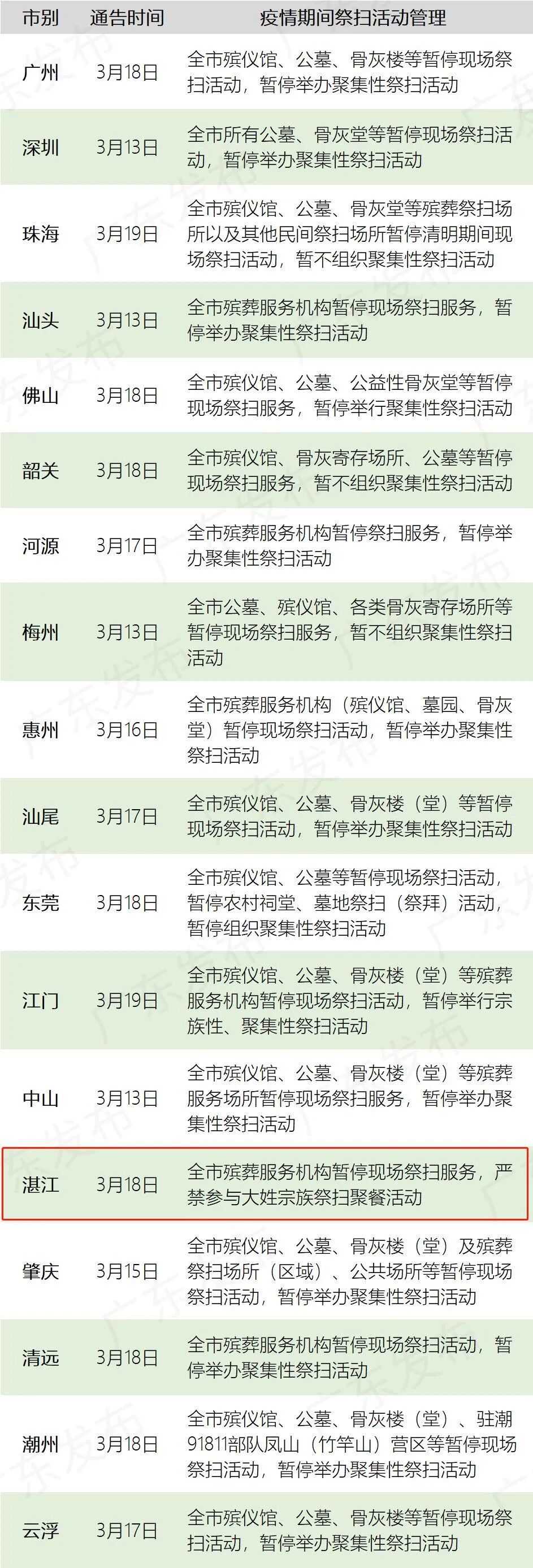为避免因清明祭扫人员聚集引发病毒传播和交叉感染风险广东大部分地市已发布暂停现场祭扫活动公告其他地市将陆续发出相关通知具体安排